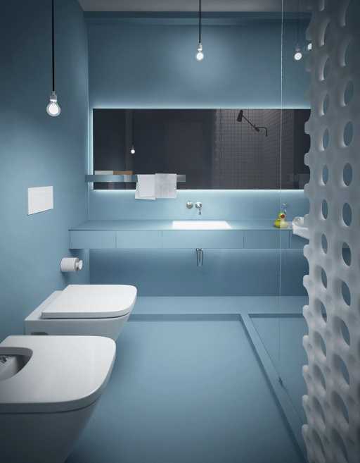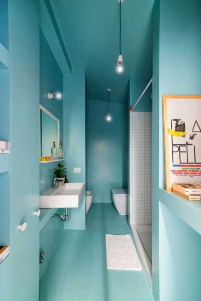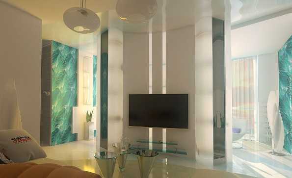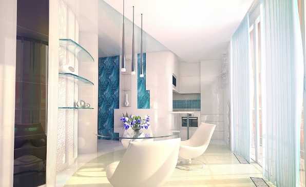 Достичь потрясающего результата удалось благодаря использованию белого цвета, сметающего границы, и бирюзового оттенка, преподносящего свежесть. Кроме того, дизайнер использовал глянцевое облицовочное сырье, большое количество осветительных приборов, компактную мебель, минимум аксессуаров, грамотно зонировал пространство с помощью функциональных перегородок, что позволило разделить квартиру на области, требующиеся для полноценной жизнедеятельности хозяев.