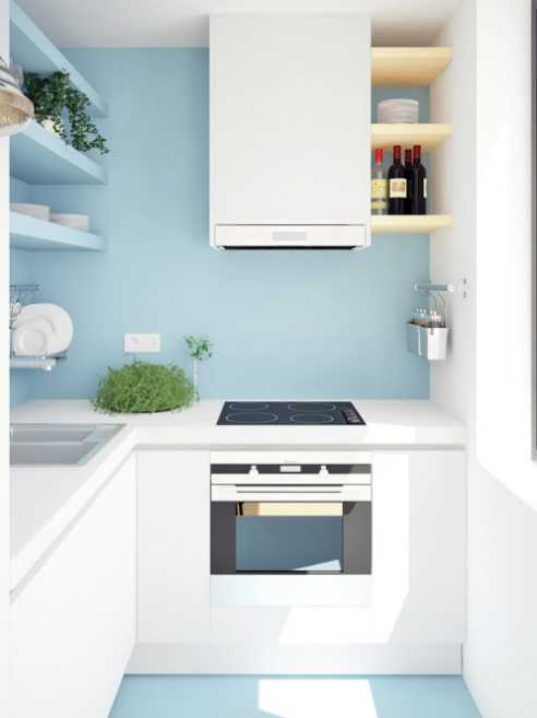 В рабочей кухонной зоне устанавливается функциональный гарнитур или встроенная мебель с бытовой техникой. В малогабаритном помещении рациональнее иметь минимальное количество оборудования, только самое необходимое. Если на кухне расширить подоконник и под ним разместить полки, выдвижные ящики, таким образом можно создать дополнительное место для бытовой техники, хранения посуды или других необходимых вещей.