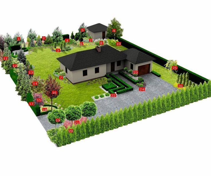 Тут можно разве что разбить газон или высадить неприхотливый кустарник. Дополнительные постройки (туалет, колодец, навес для автомобиля) в таком случае будут располагаться по углам территории, равноудалено от дома.