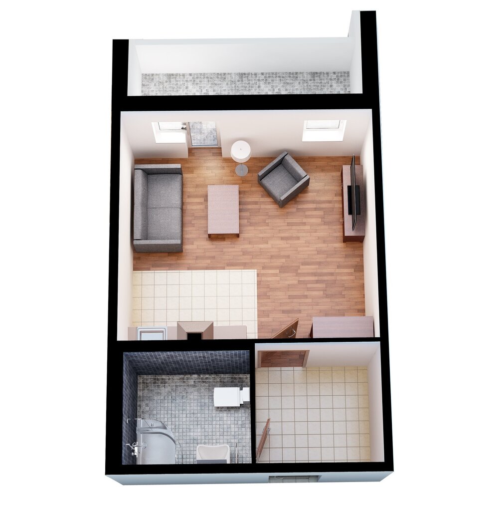 В случае с квартирой-студией справедливо говорить не о площади, а об объеме: возможно ли установить «вторым этажом» спальные места и разного рода шкафы и антресоли для хранения нужных сезонных вещей, которым не осталось места на «первом» этаже; - имеется ли в помещении балкон, а лучше лоджия, которые, как правило, совмещаются с основным помещением, позволяя значительно выиграть в дополнении к полезной площади и способах ее использования;