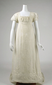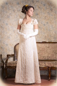 Белое из легкой ткани, часто шелковой, платье в стиле ампир по последней моде того времени зачастую надевалось влажным, чтобы ткань обтягивала фигуру и, таким образом, женская фигура напоминала белые мраморные колонны античных храмов.