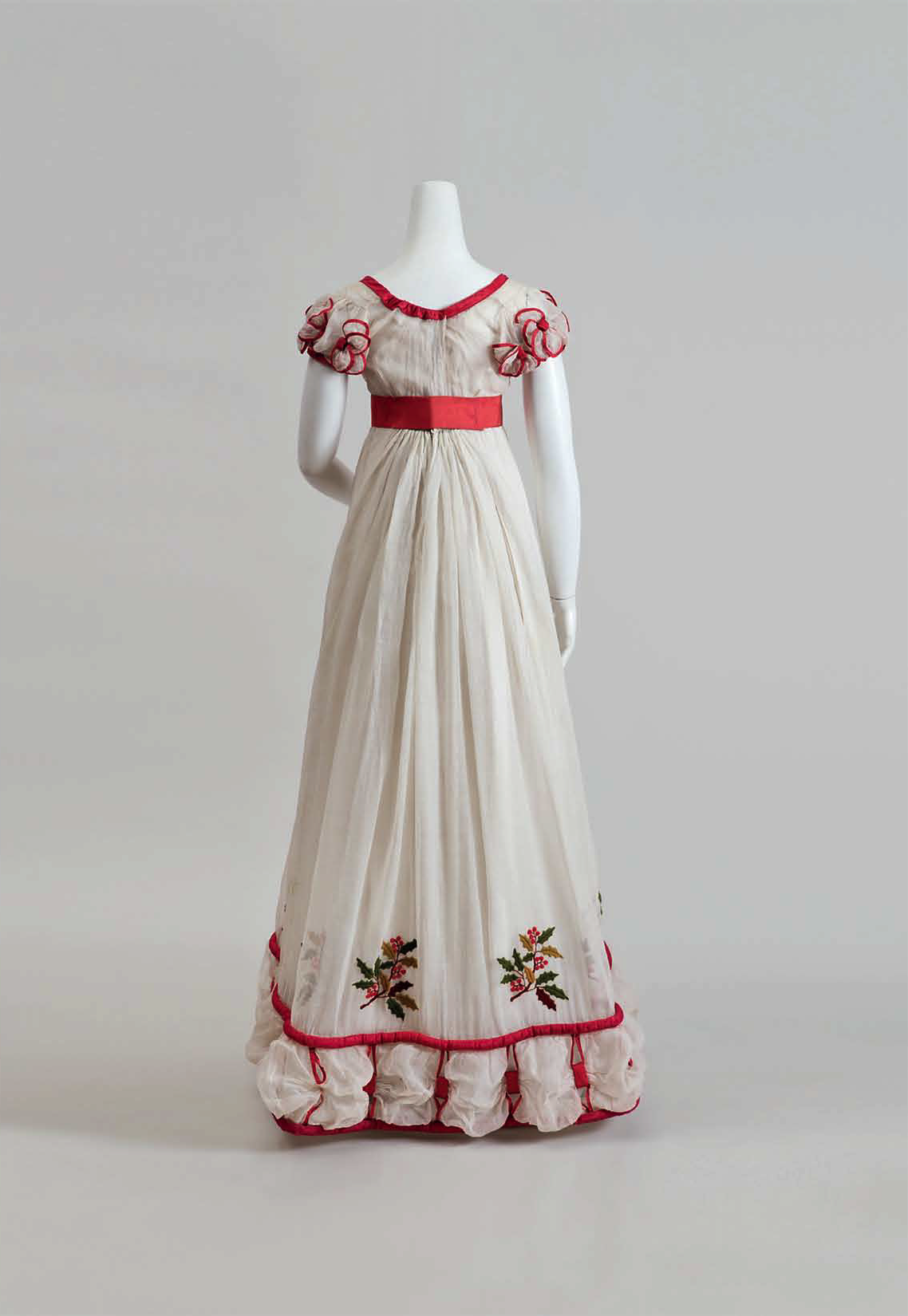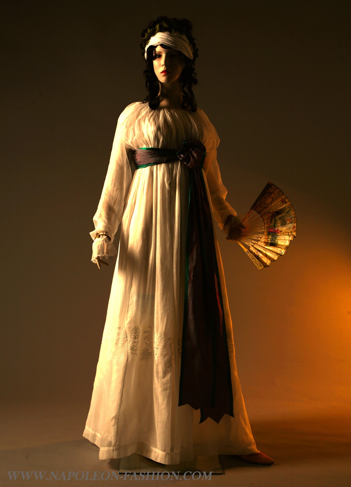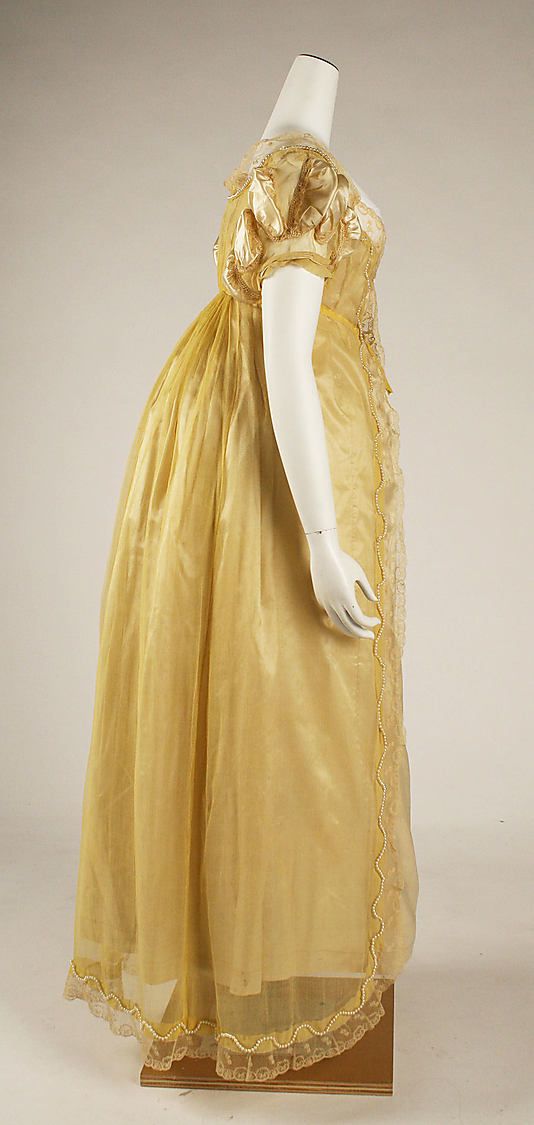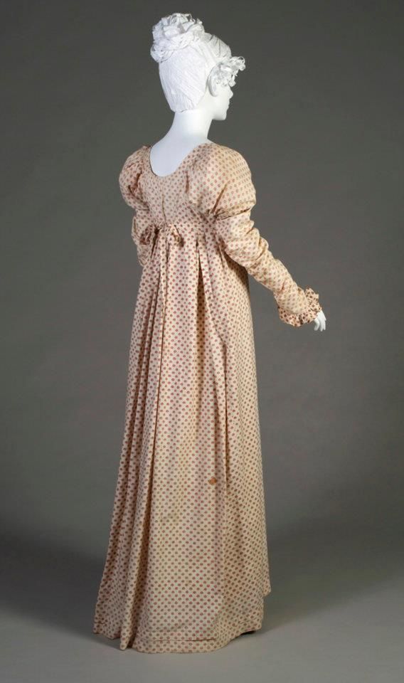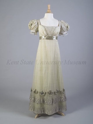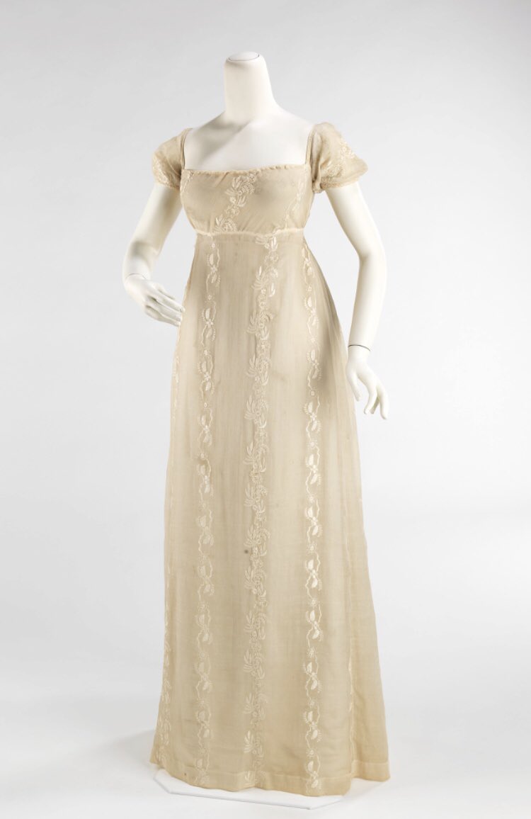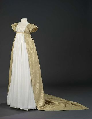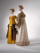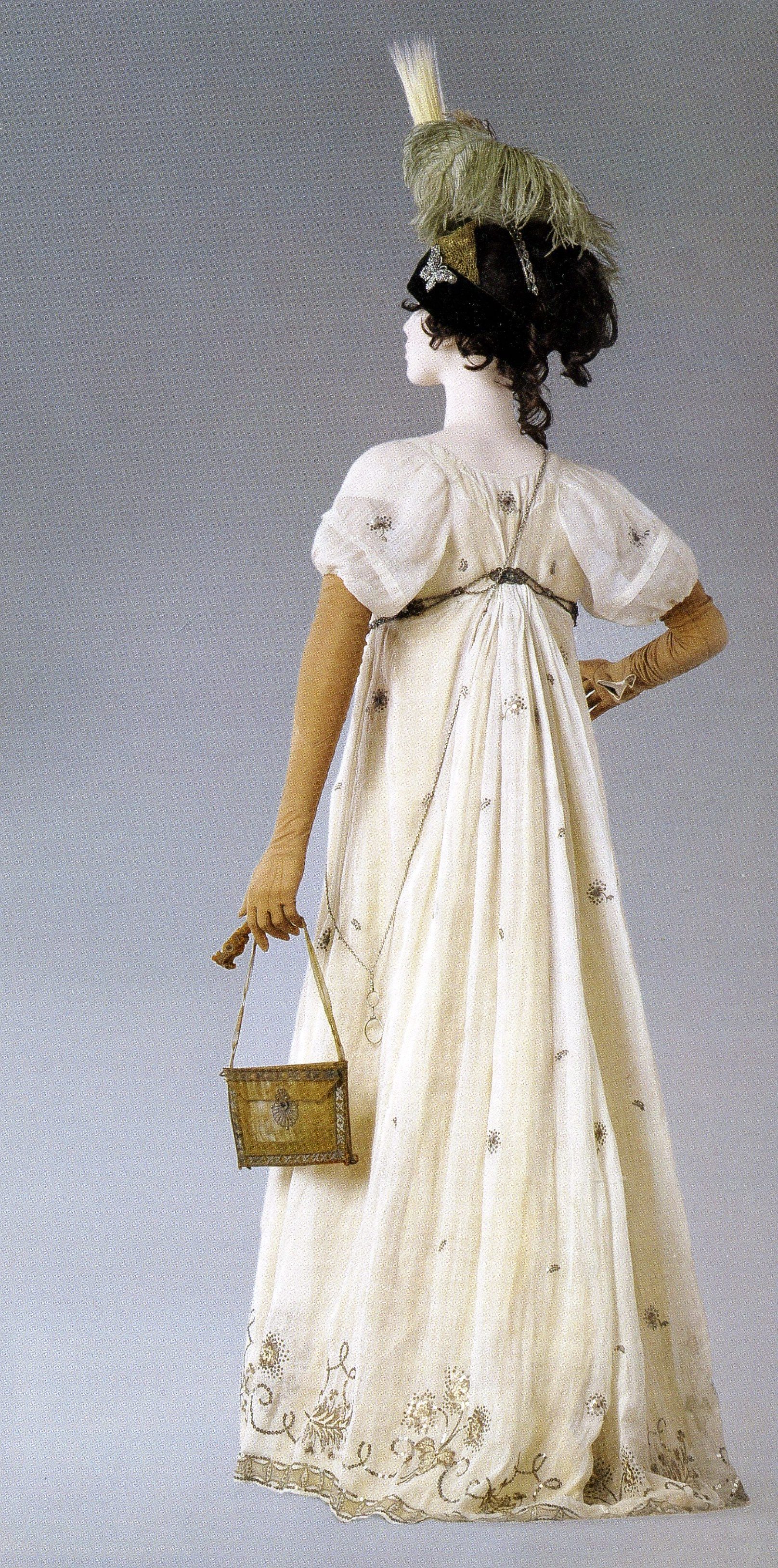 В 1805−1810 годах женская мода не отличается сложностью форм. В это время царит стиль ампир. Дамы носят платья с завышенной талией. Муслин, креп, кружево — самые популярные материалы.