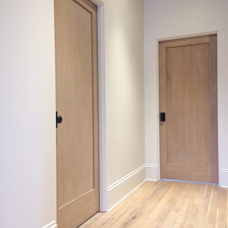 Сочетание пола и дверей одного цвета будет выглядеть гармонично, а контрастный плинтус позволит избежать монотонности.