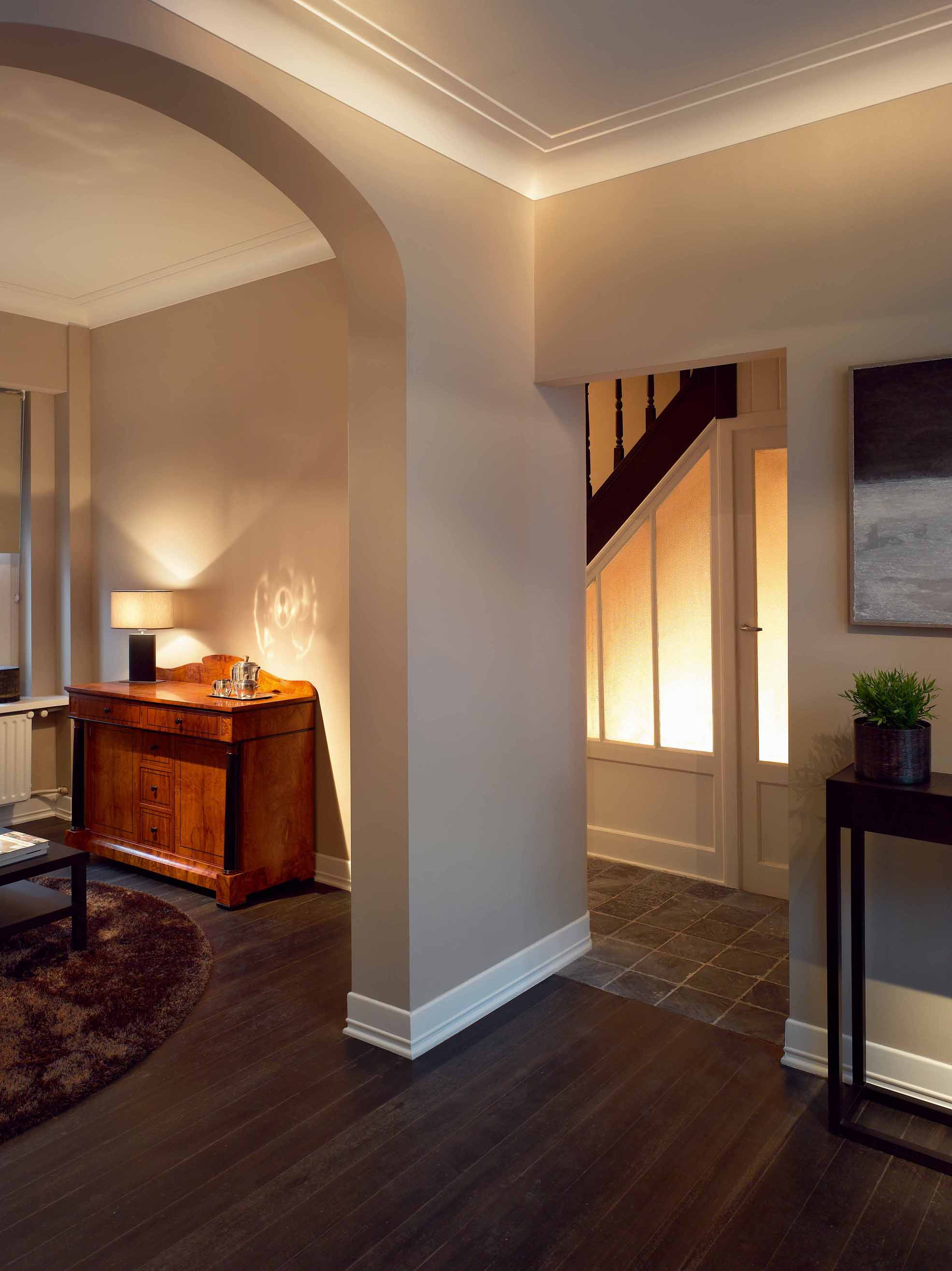 3. Подсветка плинтусов и шлаков при низкой или стандартной высоте помещения. Это создаст две горизонтальные линии, которые скрепят стены и заставят комнату казаться меньше, а потолок ниже.