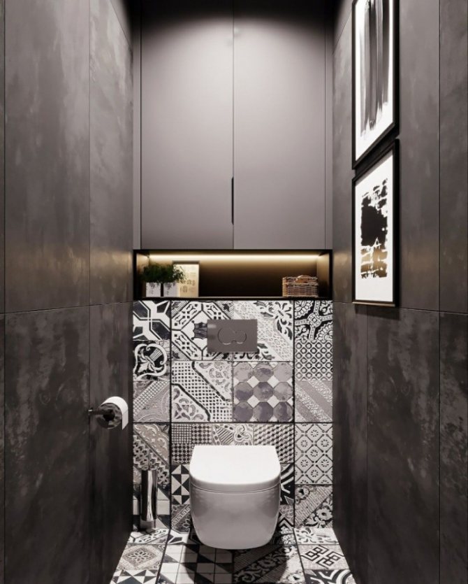 Удачным вариантом оформления туалета способно стать использование на одной поверхности нескольких видов плитки, которые отличаются оттенком или фактурой.