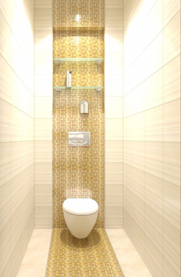 Однотонное оформление туалета иногда может выглядеть скучно. Чтобы сделать маленькую ванную более уютной, можно добавить яркие акценты: горизонтальные полосы из декоративного бордюра или полки из разноцветной мозаики.