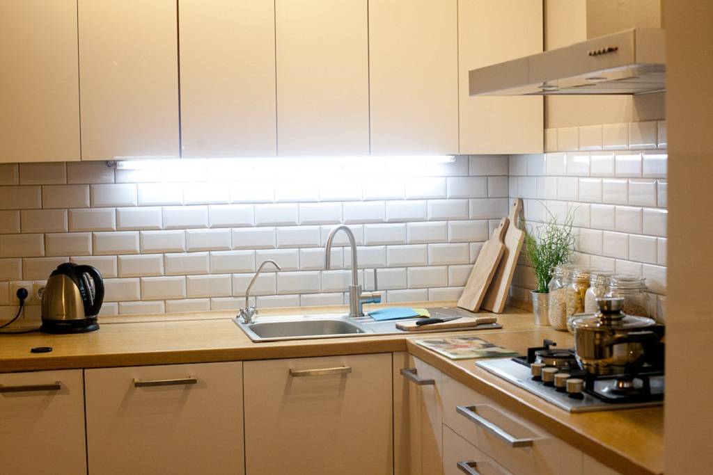 Перед укладкой плитки уточните размеры фартука у поставщика кухни. В среднем, его высота составляет от 48 до 60 см и он должен на пару сантиметров заходить под верхние шкафы и столешницу.