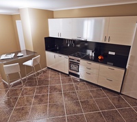 На мой взгляд, плиточный пол на кухне по оттенку должен занимать промежуточное положение между тоном стеновой облицовки и цветом кухонного гарнитура. Например, чуть темнее стен, но светлее мебели (разница в 2-3 тона) или наоборот.