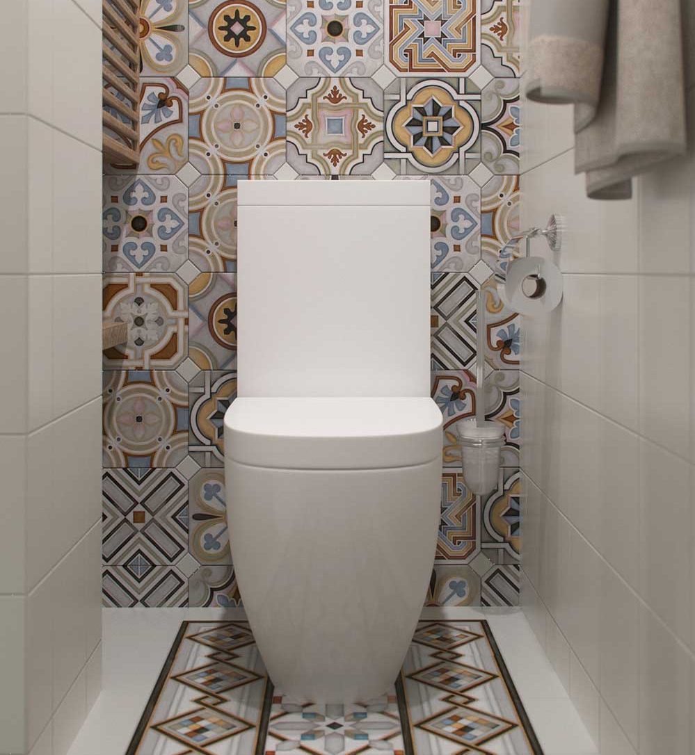 Один из вариантов использования плитки с орнаментом – оформление акцентной стены. Яркий и самобытный интерьер в этом случае вашему туалету обеспечен.