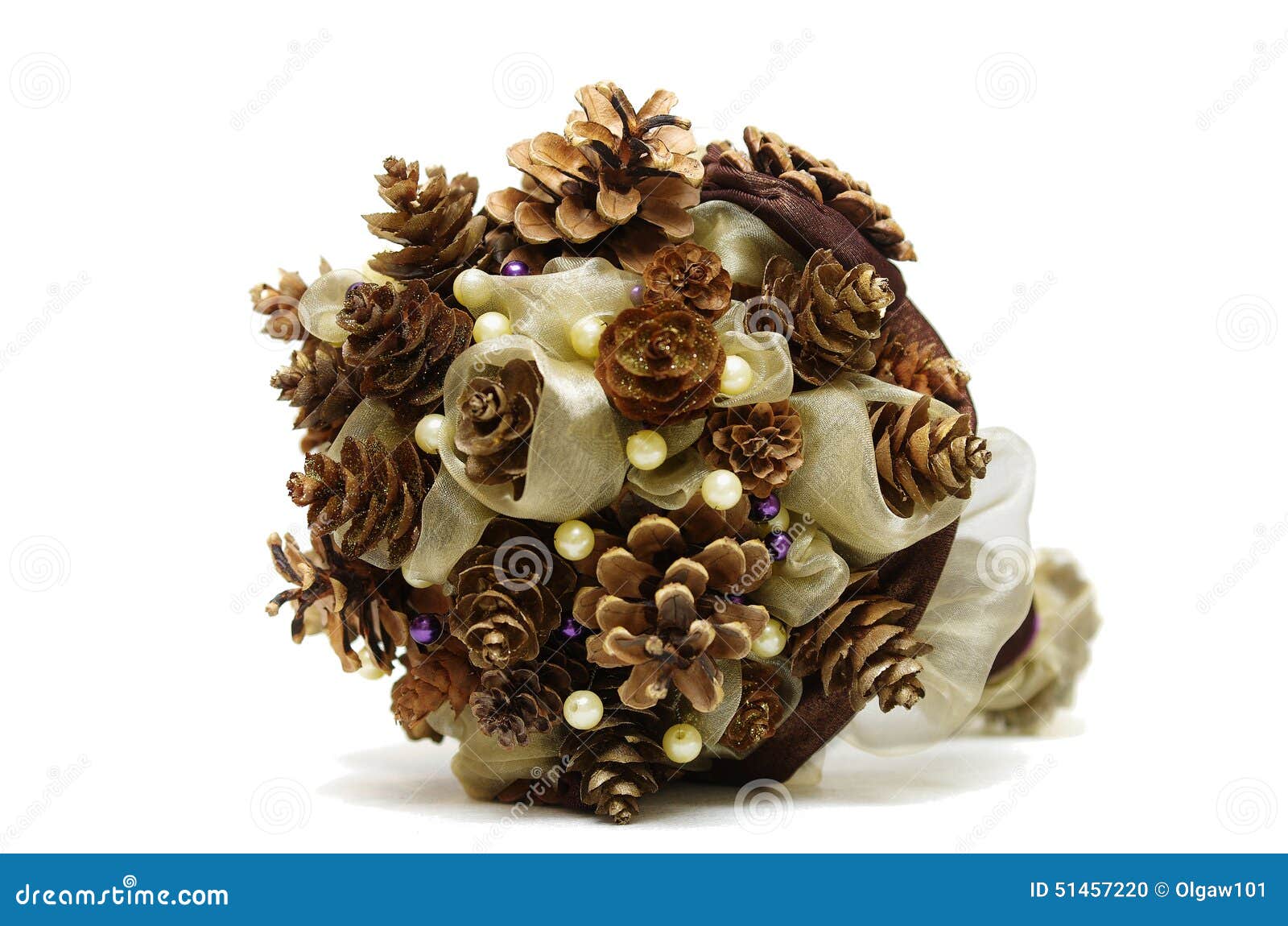 Затем следует аккуратно приклеить к основе шишки и прикрепить к шару красивую атласную ленточку.