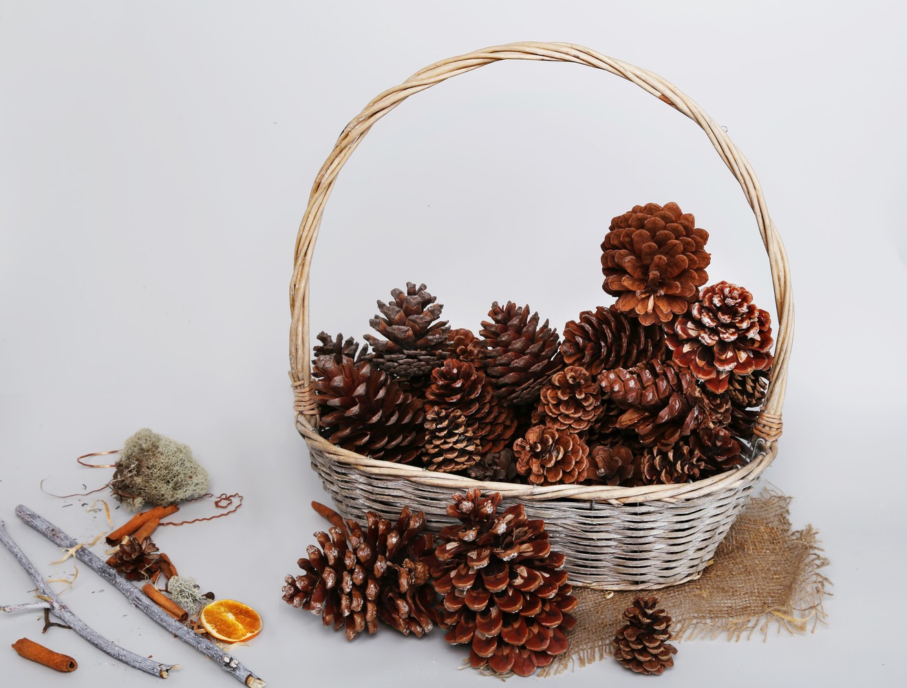 Большая «шишечная» корзина, даже не имеющая никакого декора, станет отличным украшением для интерьеров в стиле кантри, рустик, лофт, скандинавский и многих других.