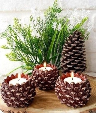 Подставку делают из одной или нескольких шишек. На изделии можно закрепить продолговатую или чайную свечу. Дополнительно используют плоские тарелки и емкости. Красиво смотрится банка, украшенная бантиком, с маленькой свечой на шишке. Это небольшой перечень идей для конструирования подсвечника. Для работы понадобятся игольчатые плоскогубцы. С их помощью выравниваются чешуйки. Низ почки должен быть параллельным относительно поверхности. Это касается и верха — его выравнивают, после чего наносят разогретый клей для закрепления свечи. Надежное крепление обеспечивается благодаря металлическому штырю — на острие насаживается свеча. В этом случае клей не понадобится. Вместо штыря также используют швейные иглы. Из соображений безопасности делают прокладку (чаще всего из фольги), чтобы горячий воск не попадал на изделие.