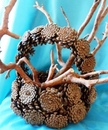 Собранная из таких деталей конструкция не деформируется в процессе эксплуатации. Желательно использовать не поврежденные вредителями элементы одинаковой формы, вида – совмещать еловые с сосновыми проблематично, а шишечки ольхи подойдут разве что для внешнего декора готового предмета.