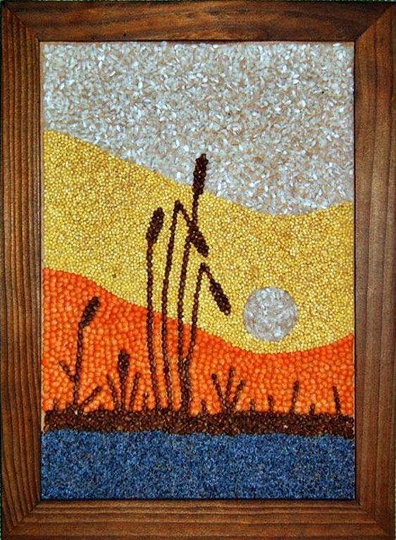 Можно декорировать семенами различные предметы: фото рамки, вазы, статуэтки, магниты на холодильник. Многие известные художники используют крупы в создании своих скульптур. Такие скульптуры пользуются огромной популярностью за рубежом.