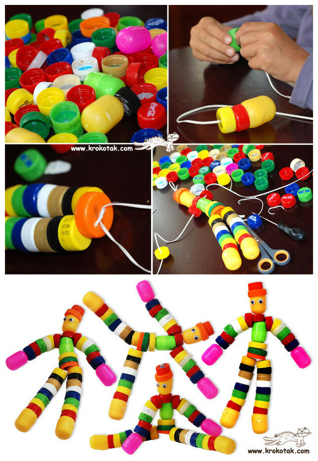 Пластиковые крышечки от бутылок легко превращаются в птиц, рыб, зайцев и лягушек. Лапки, мордочки, хвосты и другие недостающие детали можно доделать из бумаги или других подручных материалов.