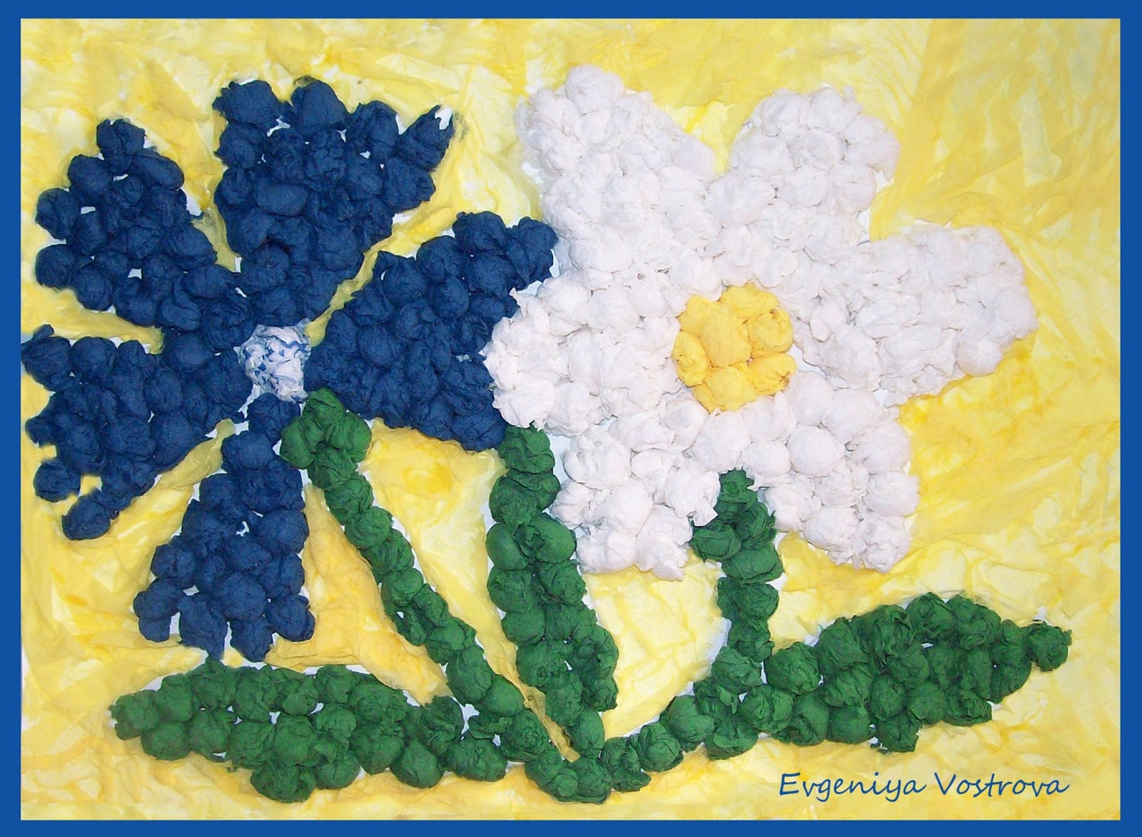 Подобная поделка точно займёт первое место на детском конкурсе. Для её изготовления приготовьте гофрированную зелёную бумага, жёлтые салфетки, степлер, туалетную бумагу, клей, неглубокую широкую вазу и тарелку с водой. Создание поделки предусматривает такие этапы: