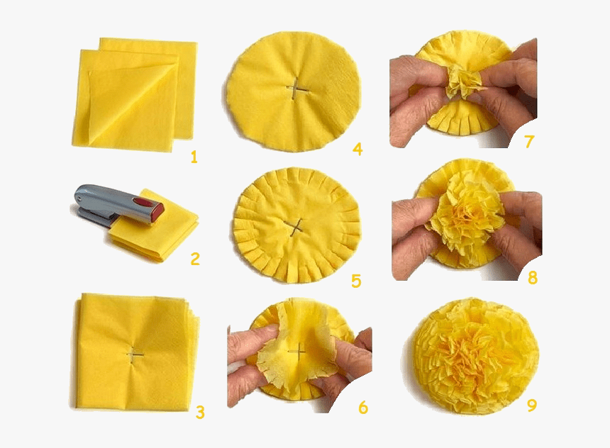 Самый популярный вид салфеточных поделок — цветы. В этом случае вам понадобятся красные салфетки, гофрированная зелёная бумага, карандаш, скотч и шпажки, помимо основного «набора». Процесс будет выглядеть следующим образом: