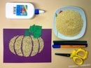 Техника приклеивания круп на бумагу отличается от уже представленной ранее версии с кофейными зернами. Например, бобовые можно клеить по отдельности. Мелкие крупы можно засыпать на поверхность, смазанную клеем через трафарет.