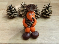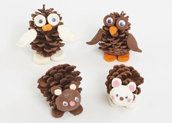 Для малышей и школьников будет просто изготовить поделки из шишек и пластилина забавных животных: Мишутку, Ежика, Бельчонка, Сову и др.