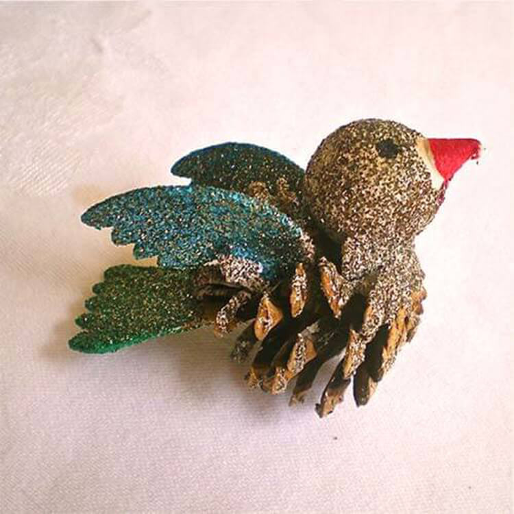 Ещё одно пернатое создание получится, если к шишке приклеить крупную деревянную бусину и крылья с хвостом из синетпона. Клюв можно сложить из кусочка картона или фетра, а глазки нарисовать маркером или фломастером.