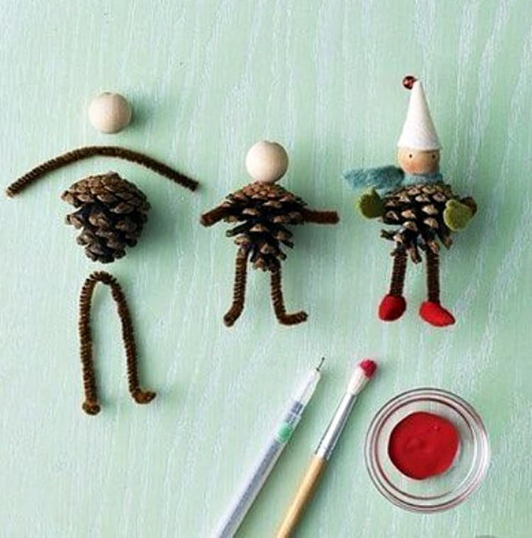 А компанию гному могут составить дружные рождественские ангелы. Приклейте к шишке деревянную бусину и нарисуйте глазки с улыбкой.