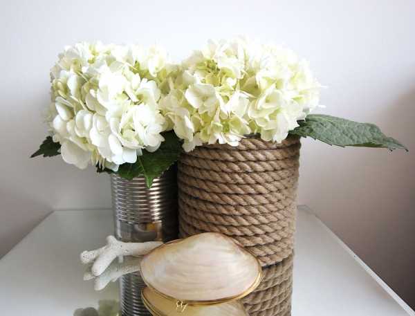 Основа тут — стеклянные вазочки разных форм. Если вы хотите, чтобы декор не приклеился к стеклу и вазочки можно было доставать из верёвочных «чехлов» и мыть, постарайтесь сделать так, чтобы в местах склеивания верёвок клей не попал на стекло. Если эта опция не важна, можно клеить прямо на стекло. Подобным же образом можно оформить жестяную банку, предварительно обработав острые края.