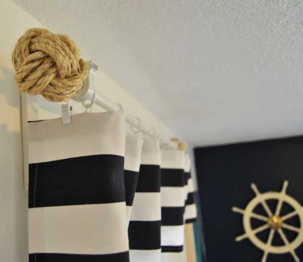 Такой материал достаточно прочный для выдержки материала, из которого будут сделаны шторы. При этом веревка поможет привнести интерьеру морскую тематику, что отлично смотрится в гостиных/спальнях.