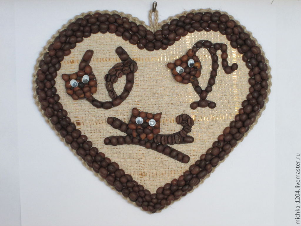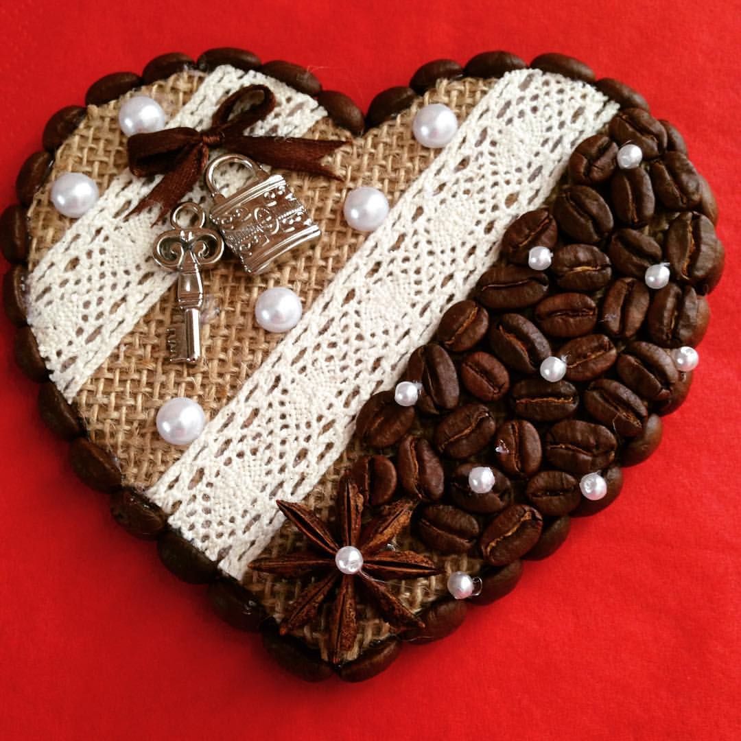 За основу сердечка берется прочный картон. На него наклеивается с двух сторон мешковина на клей ПВА. По периметру поделки размещается пеньковая веревка. Из углубления верхней части выводится петля, чтобы своими руками поделку из кофейных зерен можно было повесить на крючок.
