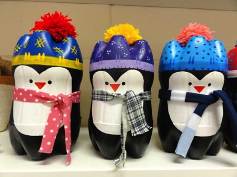 Например, симпатичный розовый поросенок из 5-ти литрового бутыля. Он может быть как украшением придомового участка, так и оригинальным вазоном для цветов. Забавные пингвинчики, оформленные с использованием красок, станут прекрасным дополнением новогоднего интерьера. Поделки из пластиковых бутылок своими руками цыплята, божьи коровки, расставленные по территории участка, значительно оживят его и, наверняка понравятся Вашим детишкам.