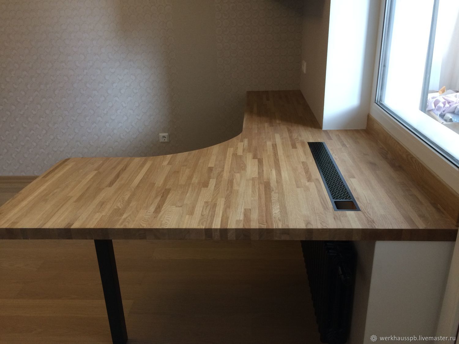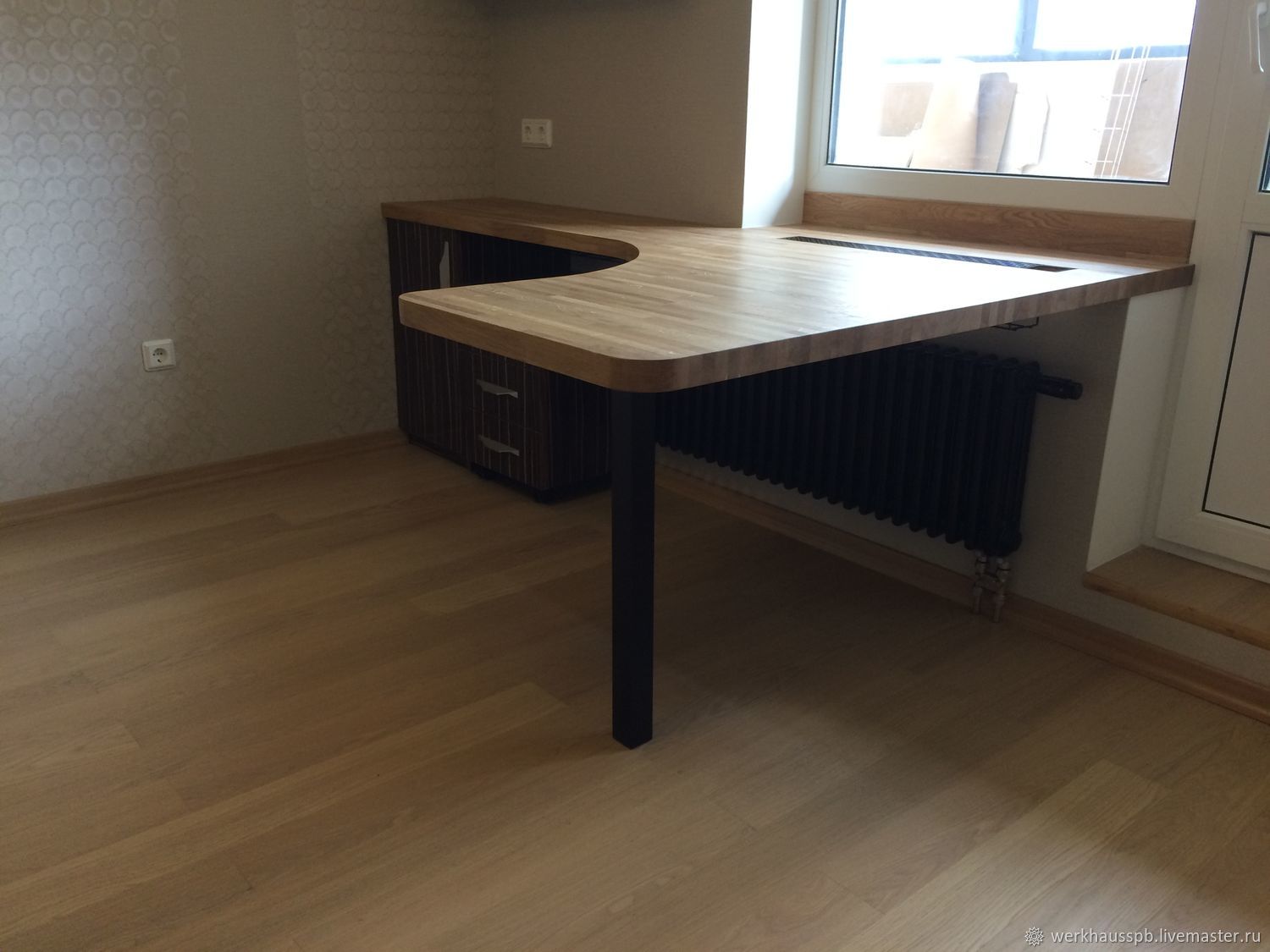 В процессе ремонта заштукатурили щель под столешницей, оклеили обоями, поставили радиатор под окно, застелили напольное покрытие и вернулись к столу.