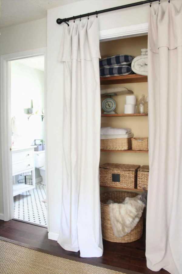 На фото белые шторы на дверном проеме в кладовке в интерьере ванной комнаты.