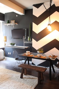 Причем совсем необязательно соблюдать симметричность – пусть полосы будут разной ширины. Подберите краску двух цветов (один из них должен быть нейтральным), и окрасьте среднюю полоску более насыщенным цветом. Необычный вид стен гарантирован!