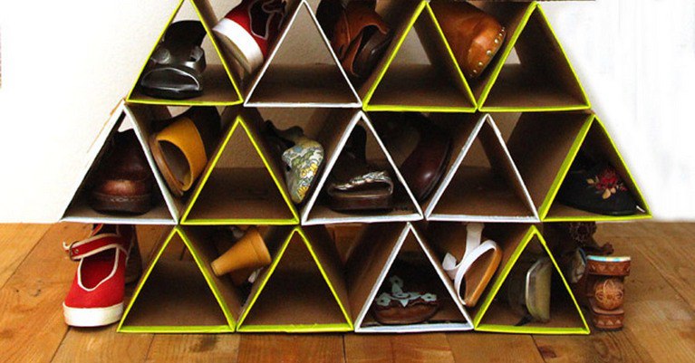 Эта полка для обуви своими руками целиком изготовлена из картонных коробок. Шаги просты, и вы можете использовать клейкую ленту, чтобы создать форму треугольника. Вам даже не нужно закрывать картон. Просто используйте красочную ленту и убедитесь, что скотченные стороны обращены вперед.
