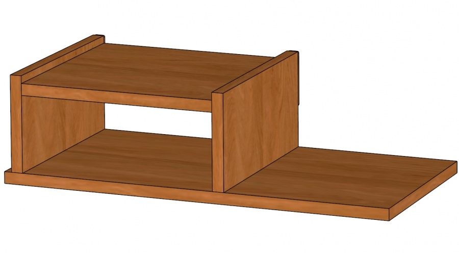 Для улучшения оригинальности внешнего вида полки следует подрезать внутреннюю стойку в двух местах. Именно внутри прорезанного участка вставляется доска. Для соединения нижней полки со внешней стойкой следует использовать конфирматы. Чтобы полка получилась ровной, без перекосов, воспользуйтесь угольником и струбциной.