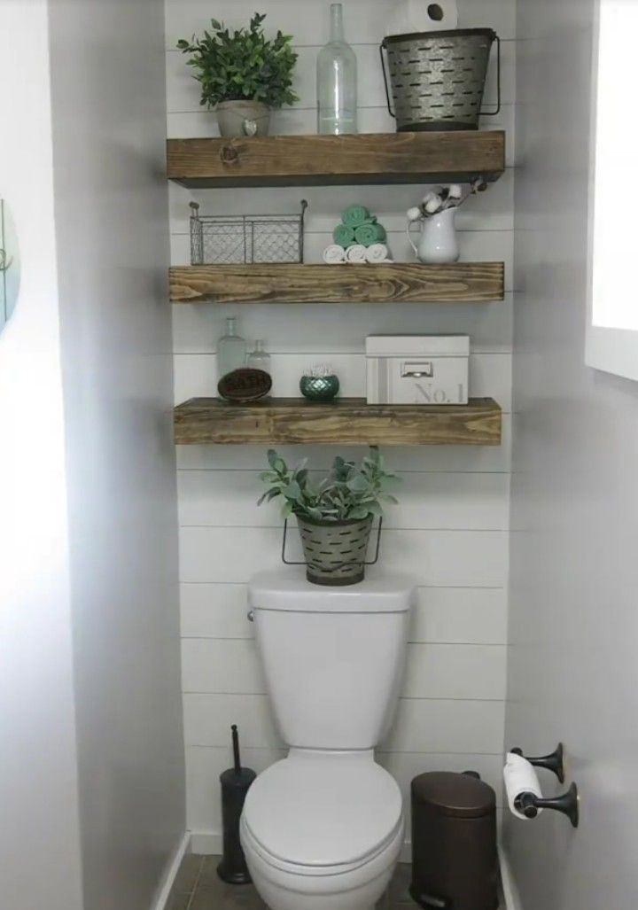 Важно помнить, что при поиске места для хранения над унитазом оно не обязательно должно быть помечено как таковое. Вместо этого вы можете перепрофилировать другие стеллажи или предметы для хранения, например полки в стиле ретро выше.