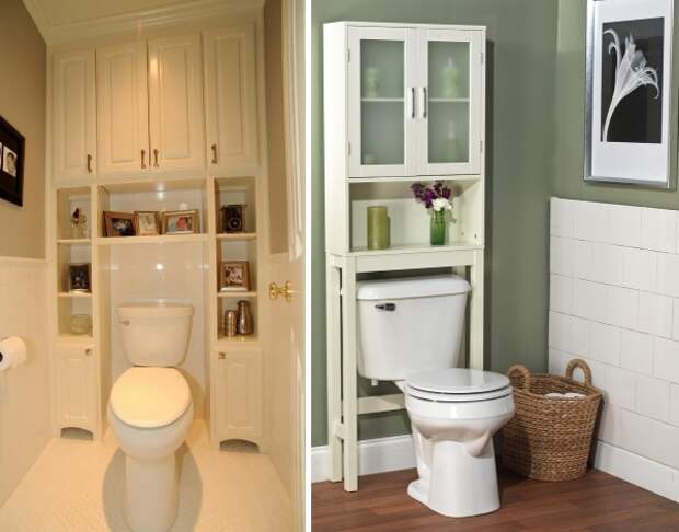 Если размеры комнаты позволяют, можно рядом с унитазом поставить шкаф. Такие шкафы чаще ставят в частных домах, так как они занимают достаточно места, которого так не хватает в небольших квартирах. При выборе шкафа за унитазом следует учитывать, что он может смотреться несколько массивно. Преимуществом такого выбора может служить то, что подобная конструкция имеет закрытые дверцы, которые защищают содержимое от посторонних глаз.
