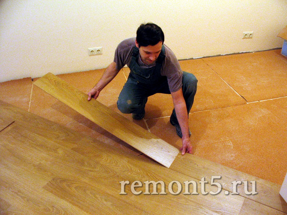 ΠΠ° ΠΏΡΠ΅Π΄Π²Π°ΡΠΈΡΠ΅Π»ΡΠ½ΠΎ ΠΏΠΎΠ΄Π³ΠΎΡΠΎΠ²Π»Π΅Π½Π½ΡΠΉ ΠΏΠΎΠ», ΠΊΠΎΡΠΎΡΡΠΉ Π΄ΠΎΠ»ΠΆΠ΅Π½ Π±ΡΡΡ ΡΡΡ ΠΈΠΌ ΠΈ ΡΠΈΡΡΡΠΌ, ΡΠΊΠ»Π°Π΄ΡΠ²Π°Π΅ΡΡΡ ΠΏΠΎΠ»ΠΈΡΡΠΈΠ»Π΅Π½ΠΎΠ²Π°Ρ ΠΏΠ»Π΅Π½ΠΊΠ°. Π’ΠΎΠ»ΡΠΈΠ½Π°, ΠΊΠΎΡΠΎΡΠΎΠΉ Π΄ΠΎΠ»ΠΆΠ½Π° Π±ΡΡΡ Π½Π΅ ΠΌΠ΅Π½Π΅Π΅ 0,2 ΠΌΠΌ. Π‘Π²Π΅ΡΡ Ρ ΡΠΊΠ»Π°Π΄ΡΠ²Π°Π΅ΡΡΡ ΠΏΠΎΠΏΠ΅ΡΠ΅ΠΊ Π½Π°ΠΏΡΠ°Π²Π»Π΅Π½ΠΈΡ ΡΠΊΠ»Π°Π΄ΠΊΠΈ Π»Π°ΠΌΠΈΠ½Π°ΡΠ° ΠΏΠΎΠ΄Π»ΠΎΠΆΠΊΠ°, ΠΊΠΎΡΠΎΡΠ°Ρ Π΄ΠΎΠ»ΠΆΠ½Π° Π½Π΅ΠΌΠ½ΠΎΠ³ΠΎ Π·Π°Ρ ΠΎΠ΄ΠΈΡΡ Π½Π° ΡΡΠ΅Π½Ρ. Π‘ΡΡΠΊΠΈ ΠΏΠΎΠ΄Π»ΠΎΠΆΠΊΠΈ ΡΠΈΠΊΡΠΈΡΠΎΠ²Π°ΡΡ ΠΌΠ°Π»ΡΡΠ½ΡΠΌ ΡΠΊΠΎΡΡΠ΅ΠΌ.