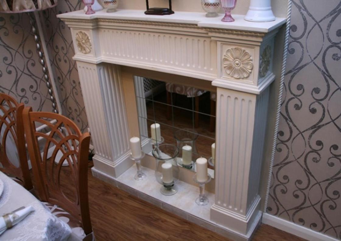 Вам потребуется создание столешницы, которая производится из пенопласта или фанеры. Далее при помощи декоративных плинтусов украсьте портал. Нанесите на камин тонкий слой шпатлевки и покройте поверхность водоэмульсионной краской.