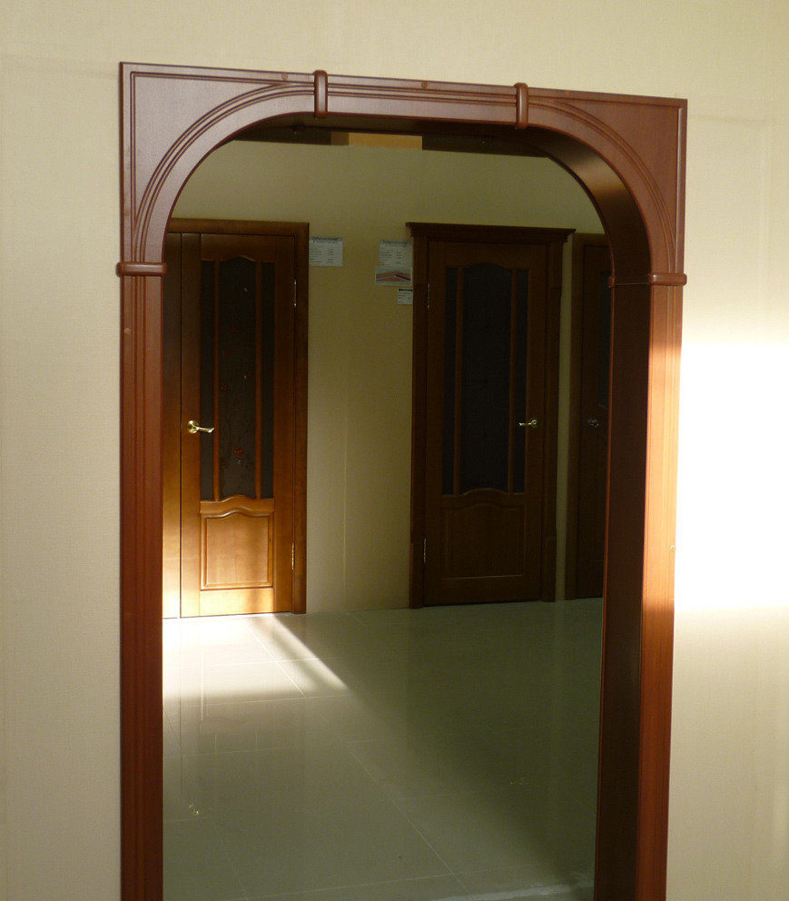 Прямоугольные и полукруглые проемы легко оформляются панелями из МДФ или пластика, которые при желании можно заменить готовым арочным комплектом в соответствии с размером входа.