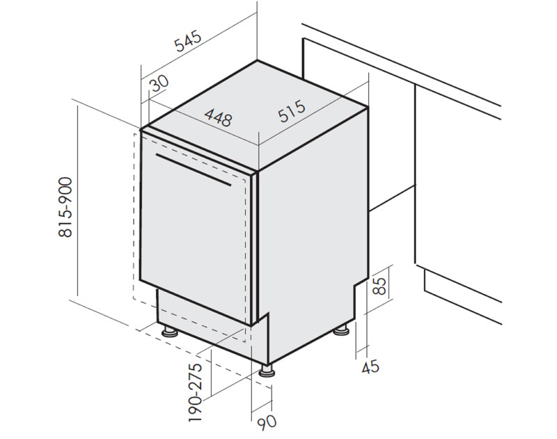 Итак, самая маленькая встраиваемая посудомоечная машина имеет ширину 44,5 см, но чаще всего ширина составляет 45 см. По сравнению с полноразмерными моделями они уже на 15 см. И это дает им следующие преимущества: