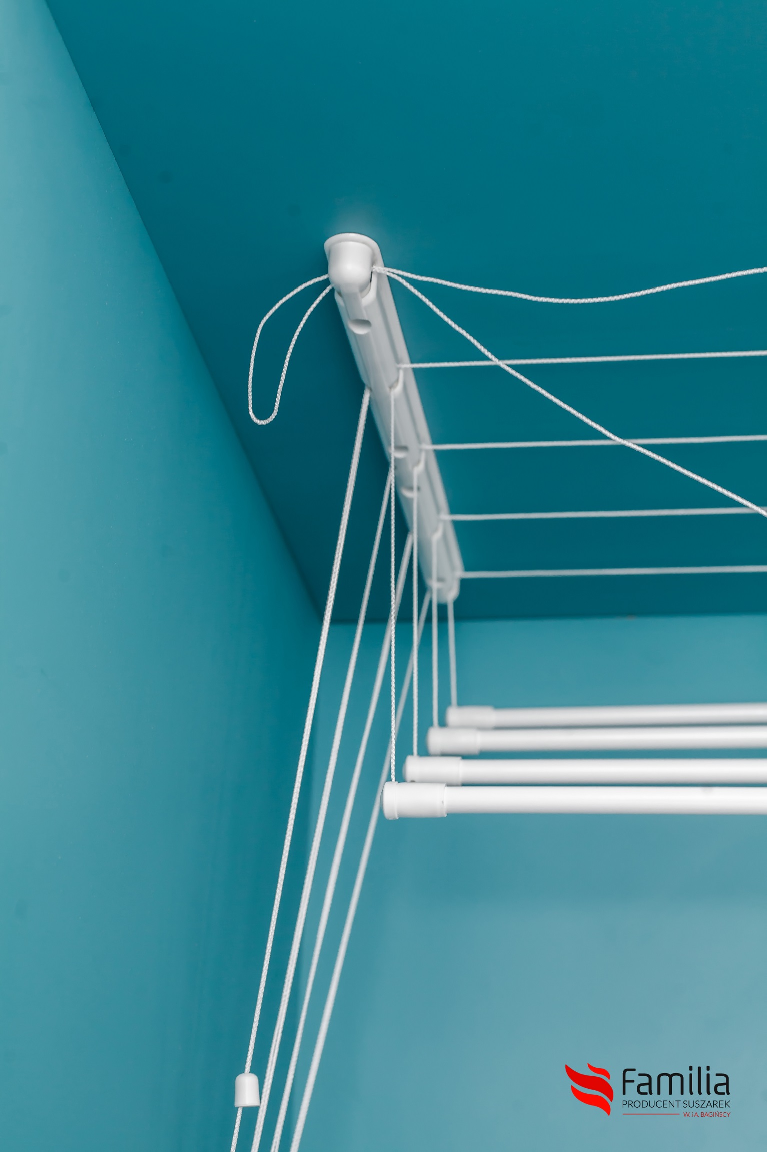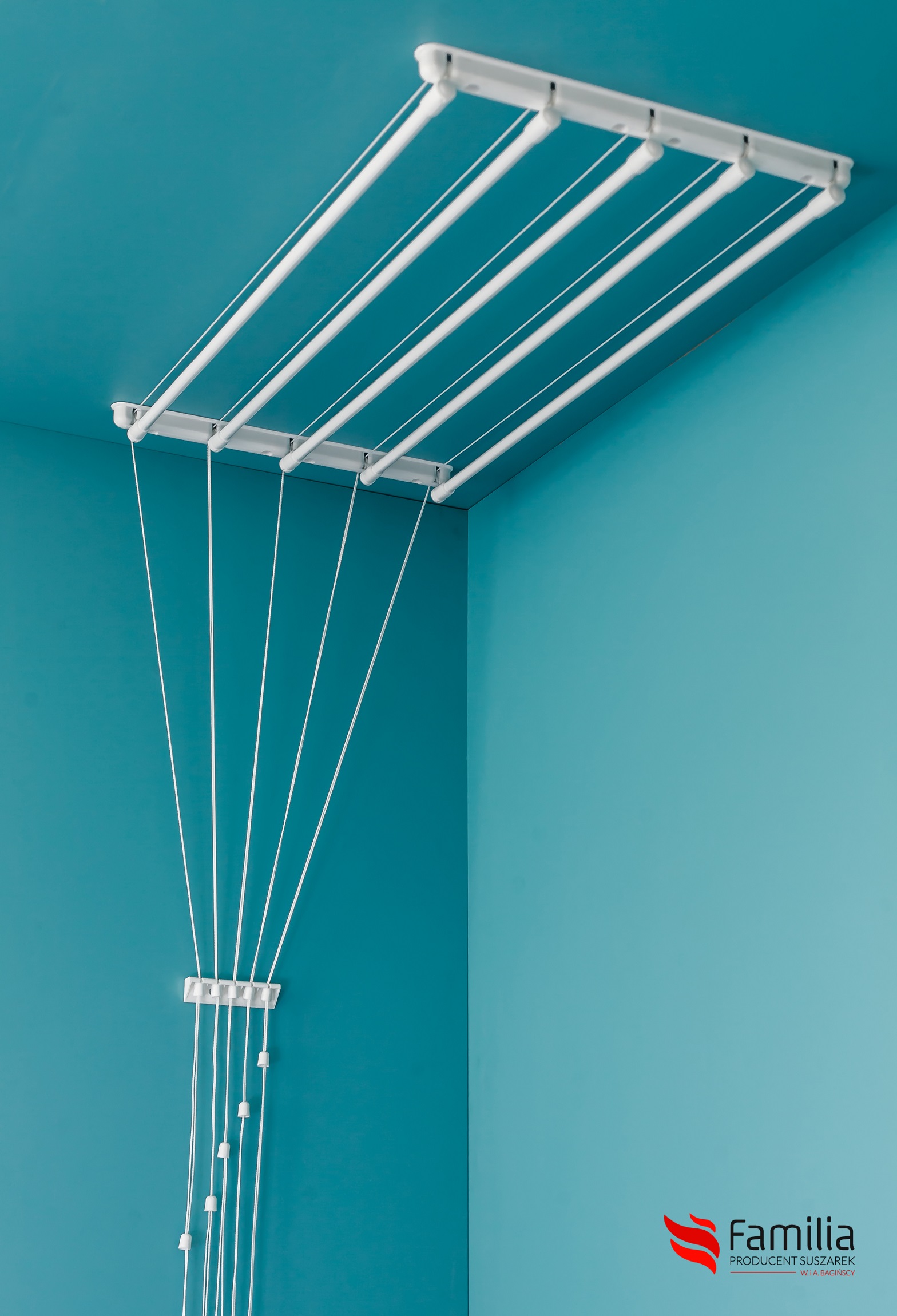 - Конец веревки крепится на стене специальной скобой. Теперь сушилку можно легко поднять или опустить, чтобы повесить белье.