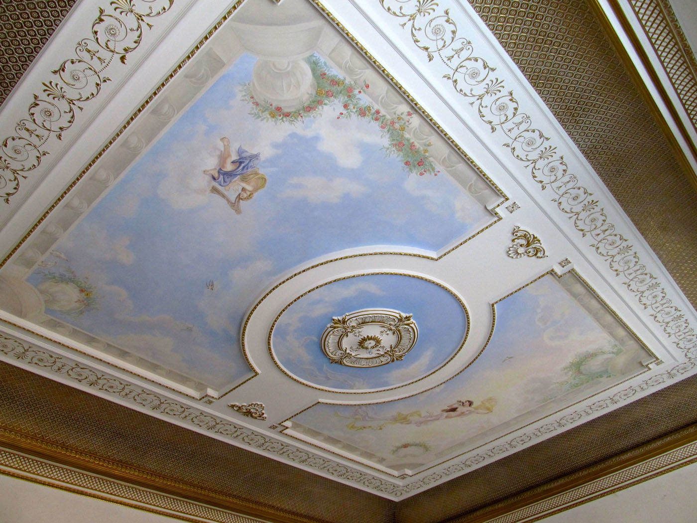 С использованием лакокрасочных материалов и художественной росписи, потолочная лепка может превратиться в настоящее произведение искусства, которое несомненно будет вызывать восхищение и восторг. Данный декор значительно преображает и оживляет помещение, и задает ему неповторимый стиль.