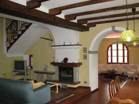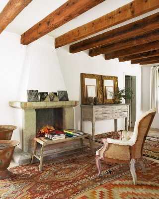 Последний вариант подходит для обычных квартир. Декоративная штукатурка, позволяющая смоделировать небольшие объёмные детали, наподобие наслоений краски, вместе с искусственными деревянными балками поможет превратить стандартную квартиру в подобие загородного дома без существенных переделок. Можно сделать и просто гладкую поверхность, задекорировав ее балками.
