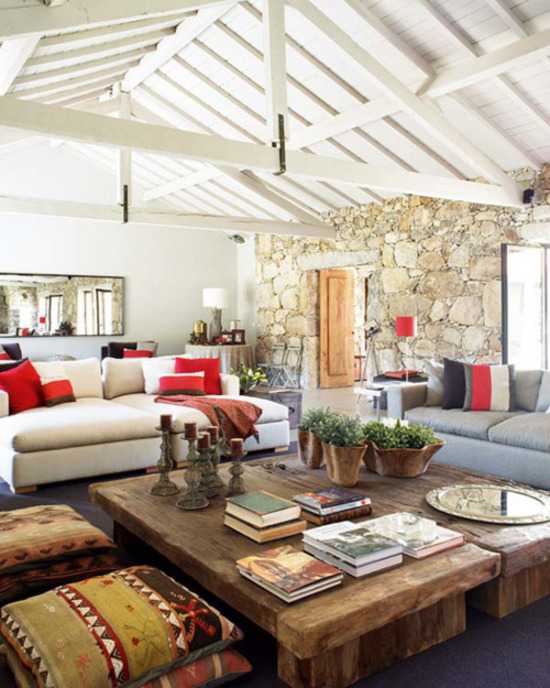 Эта комната должна стать визитной карточкой дома, поэтому при ее оформлении стоит приложить максимум усилий. Поэтому здесь можно разместить камин, стол, сделанный вручную или библиотеку. Пол можно выложить декоративным камнем, а на стенах закрепить деревянные балки.