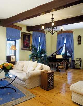 В каждой детали, даже самой незначительной, должна чувствоваться деревенская простота. Для кантри присущи натуральные древесные цвета, а вот от темных и золотых тонов стоит отказаться. В оформлении недопустимы излишества, нужно осторожно использовать разные элементы. Например, сочетание изысканной лепки, мебели с плетеными элементами или гнутыми деревянными ножками получается довольно тяжелым – уютным такое помещение стать не может. А ведь именно максимального уюта стараются добиться, оформляя комнату в данном стиле.