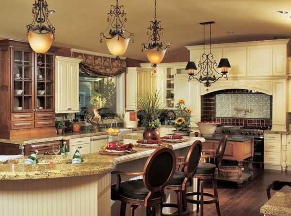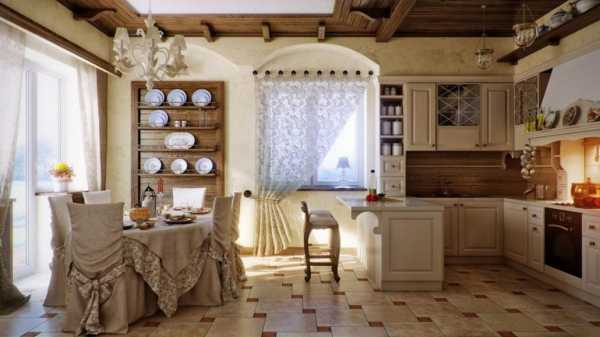 Кухня в данном стиле должна быть простой и выглядеть максимально натурально. На окна можно повесить занавески из хлопка, украшенные лентами. Стол обязательно следует накрыть скатертью, вышитую вручную. Стулья должны иметь мягкие сидения. А для освещения идеально использовать люстру с кованым основанием. Для декора используют картины с изображенным на них натюрмортом, глиняные вазы и керамические тарелки.