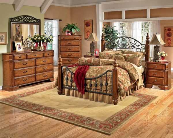 В спальне не должно быть слишком много мебели. Стоит ограничиться большой кроватью, туалетным столиком с металлическими элементами и плетеным креслом. Декорировать спальню можно используя картины с изображением красивых пейзажей, настольную лампу, практичный текстиль. Это могут быть ковры, сделанные вручную, покрывала из лоскутов или подушки из шерсти.