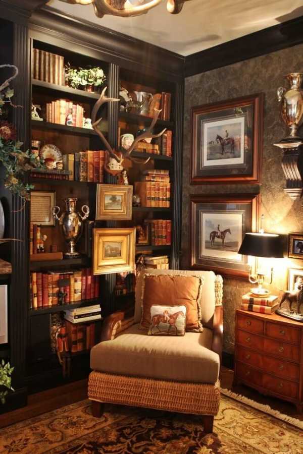 Центр комнаты может украсить библиотека, камин, а также стол ручной работы. Пол можно декорировать с помощью каменной кладки, а стены украсить деревянными балками. Также можно зонировать просторную комнату на две отдельные зоны с помощью стеллажей или кресел. В виде декора хорошо использовать кашпо, кованые подсвечники, полки с глиняными фигурками и элементами из бронзы. Разбавить однотонность помещения и текстиля можно с помощью ковриков с узорами, картин с цветочными мотивами, аксессуаров ручной работы, фотографий.