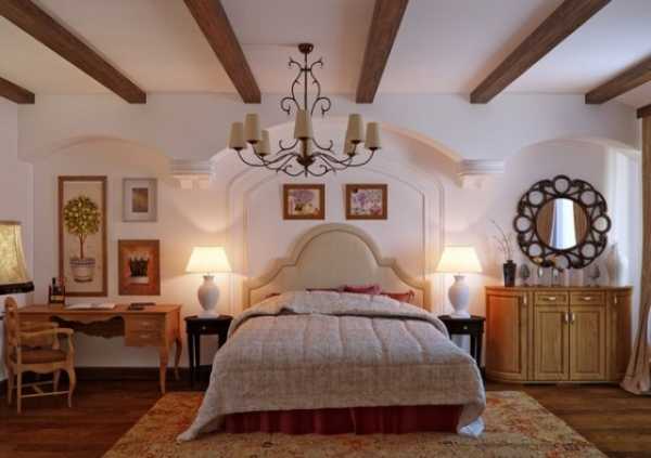 Спальня в данном стиле станет самым тихим и уютным уголком квартиры. Важно, чтобы потолок был светлым и однотонным, в то время как для оформления стен можно использовать геометрические или цветочные узоры, деревянные балки и т. д.