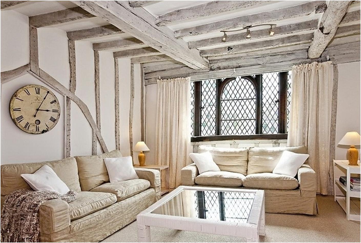 Один из наиболее распространенных вариантов дизайна — белый потолок с грубыми деревянными балками, который можно часто встретить в гостиных частных домов в Провансе. Обратите внимание на интересный прием: древесина спускается на стену, создавая там несложный, но стильный узор.
